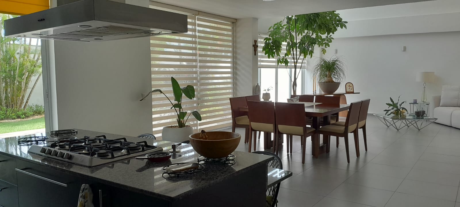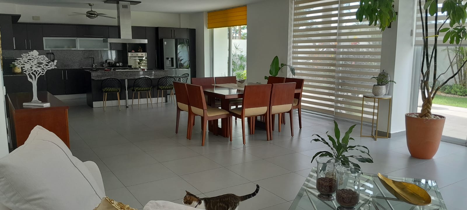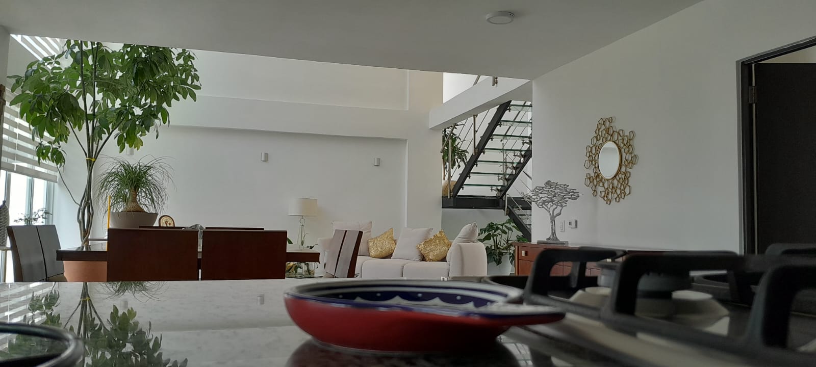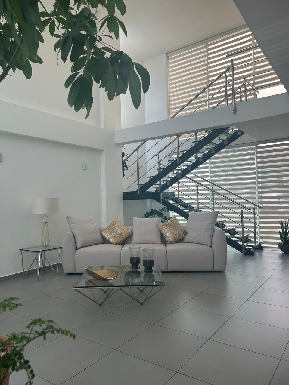 En planta baja tiene un salón de doble altura con ventanales para luz y elegancia, plantas reales altas, comedor integrado a la sala y cocina abierta. Todo en excelente estado y equipado. Lavandería, terraza.