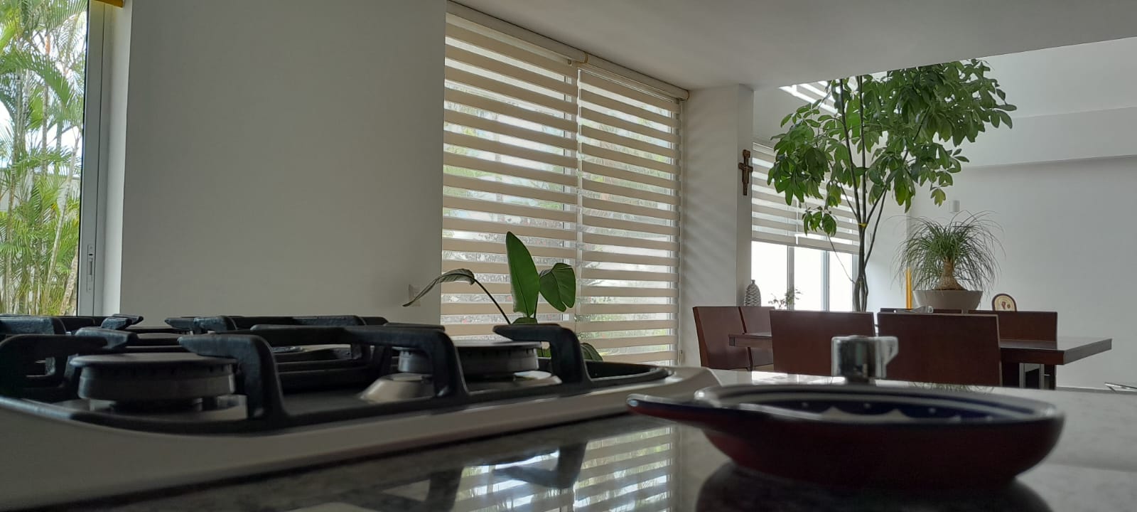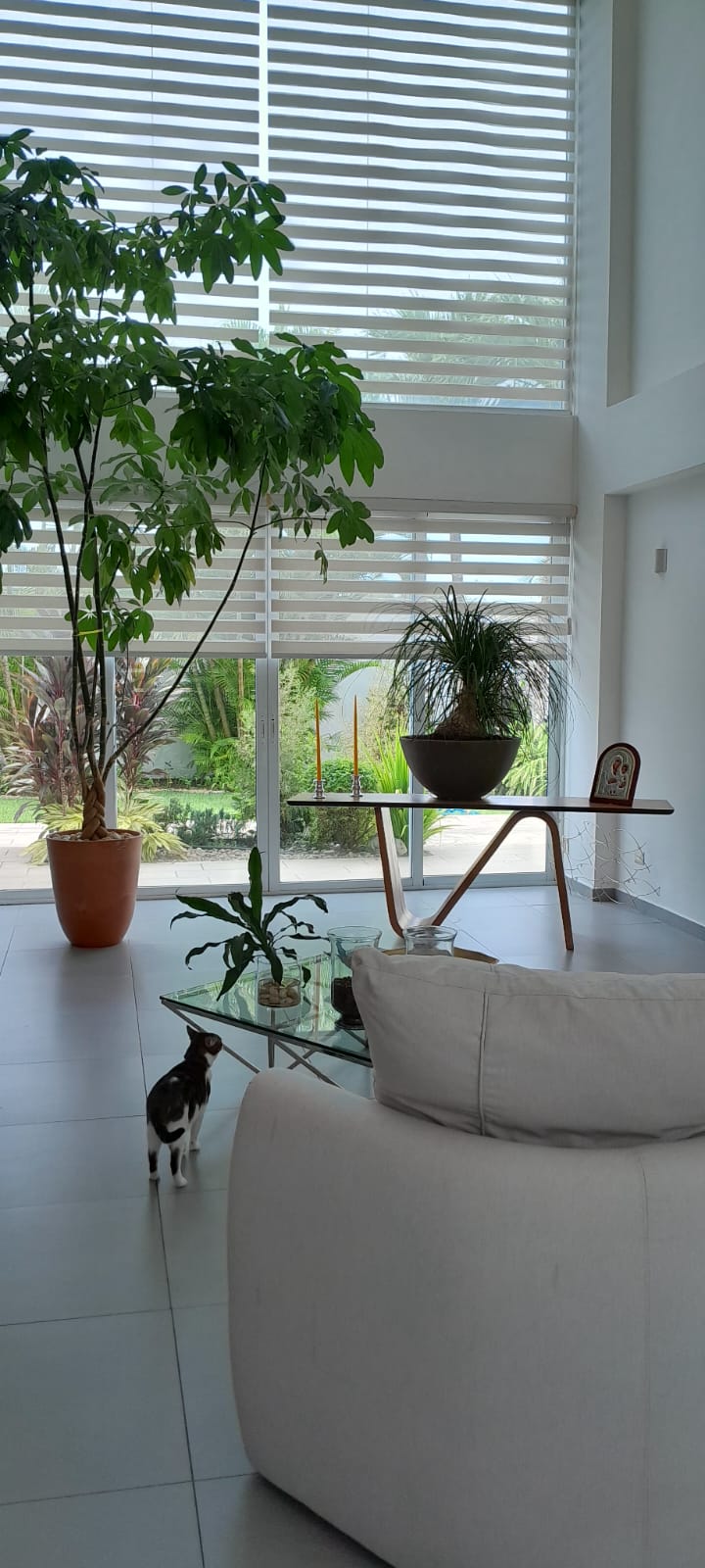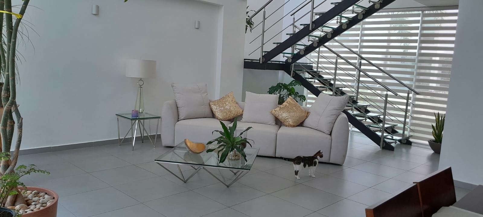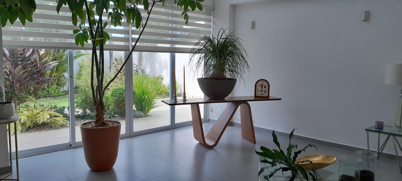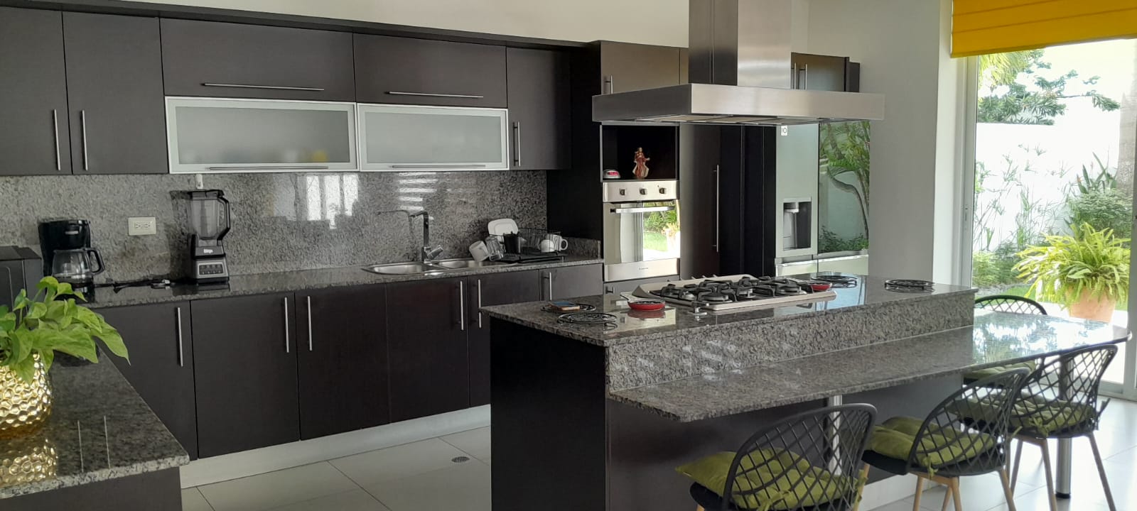 En planta baja tiene un salón de doble altura con ventanales para luz y elegancia, plantas reales altas, comedor integrado a la sala y cocina abierta. Todo en excelente estado y equipado. Lavandería, terraza.