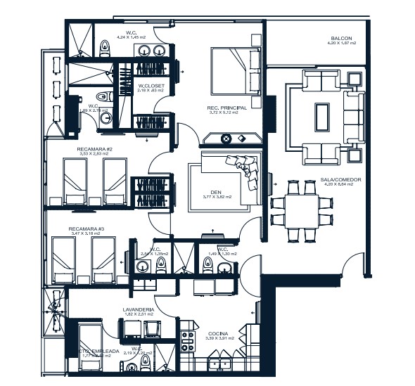 Con 3 cómodas habitaciones, cada una con su baño, Sala familiar, Cocina Cerrada, Lavandería, Cuarto y baño de servicio, Sala Comedor, Terraza, 2 cómodos estacionamientos. Fotos del anuncio son de un apartamento modelo.